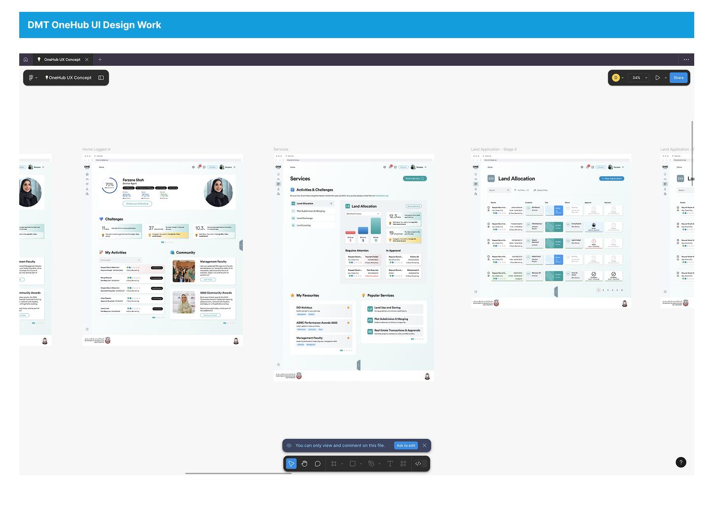 - UX - Leading the UI design for the creation of the OneHub Portal, redesigning an existing legacy platform supporting 150 services for the Abu Dhabi Government / Department of Municipalities and Transport. (Figma)