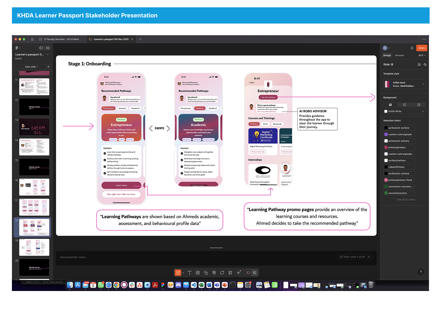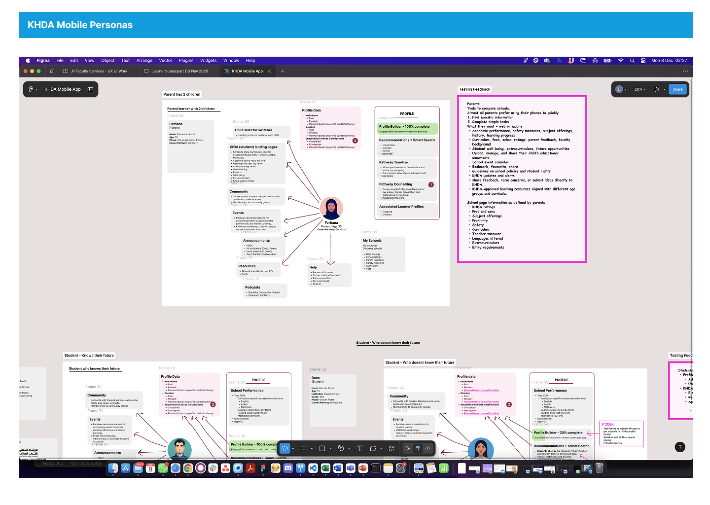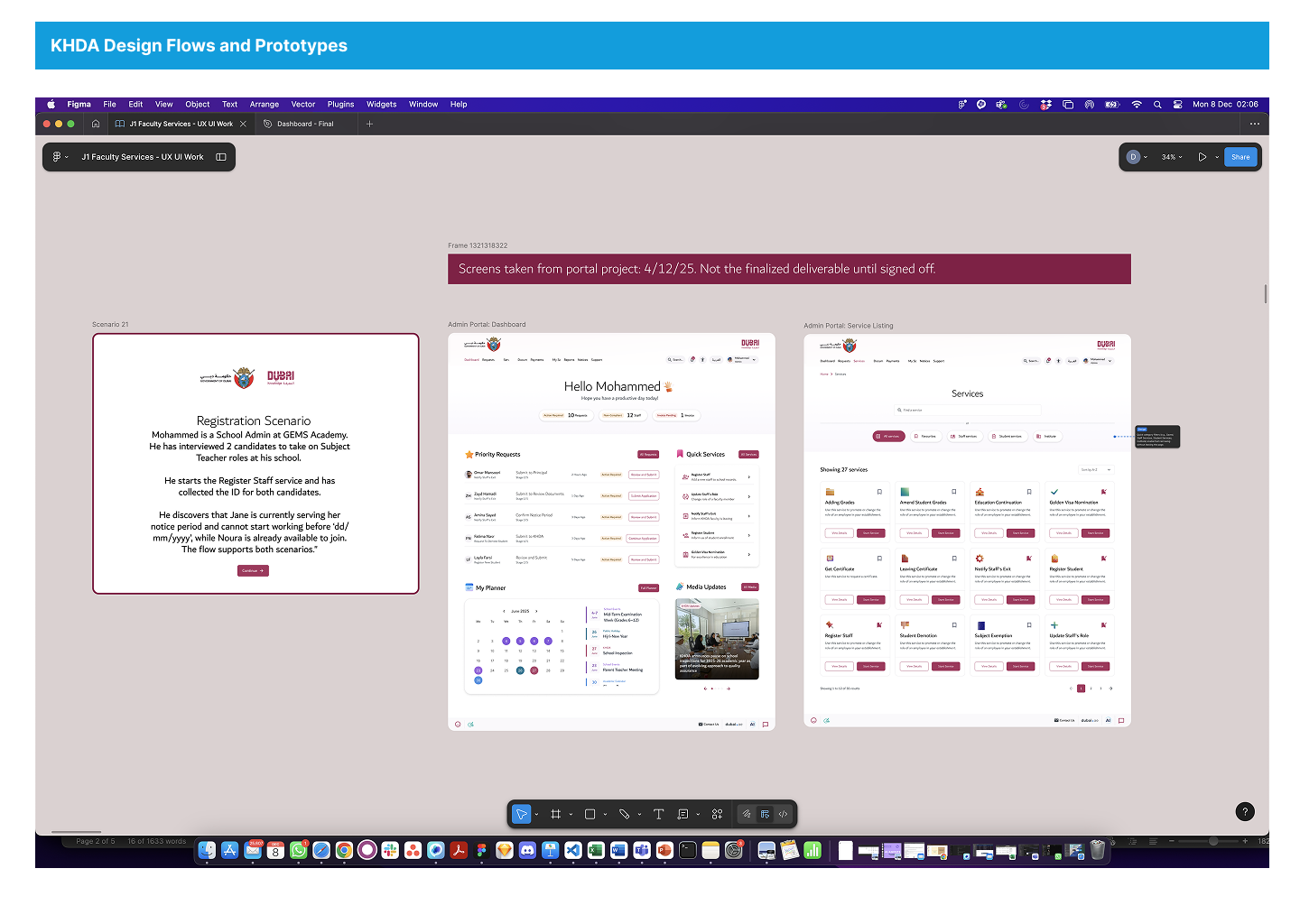 - UX - Created UX design prototypes and complex journey flows for testing and sign off, collaborating and presenting to KHDA Leadership. (Figma)